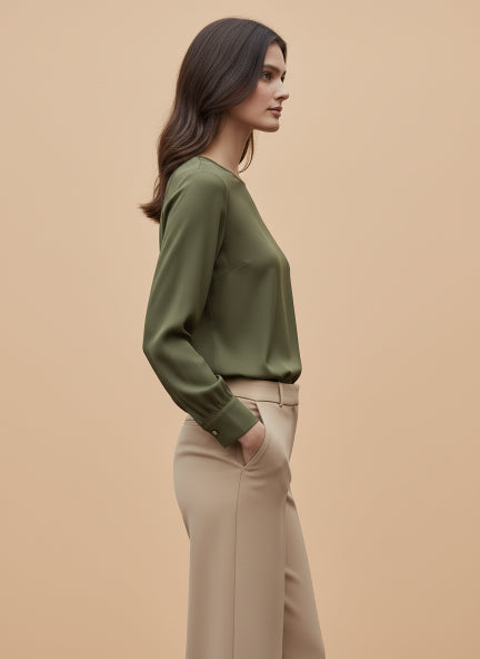 European Satin Solid Crew Neck Top