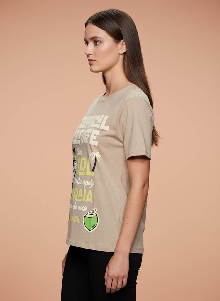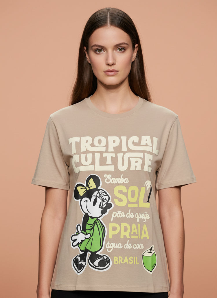 Bring Brazilian vibes and Disney charm together with this super cute beige tropical Minnie Mouse t-shirt. Featuring a vibrant graphic print of Minnie in a green dress with fun Brazilian elements like Samba, Praia, Sol, and Água de Coco, this tee is perfect for adding a playful and stylish touch to your everyday look.