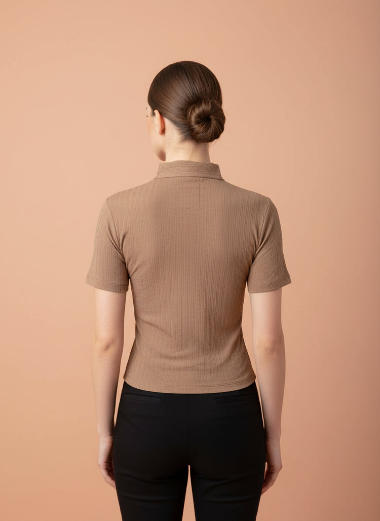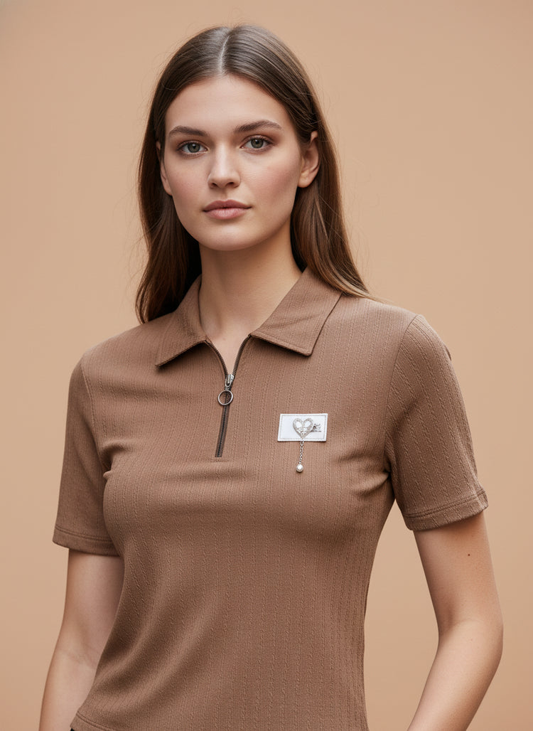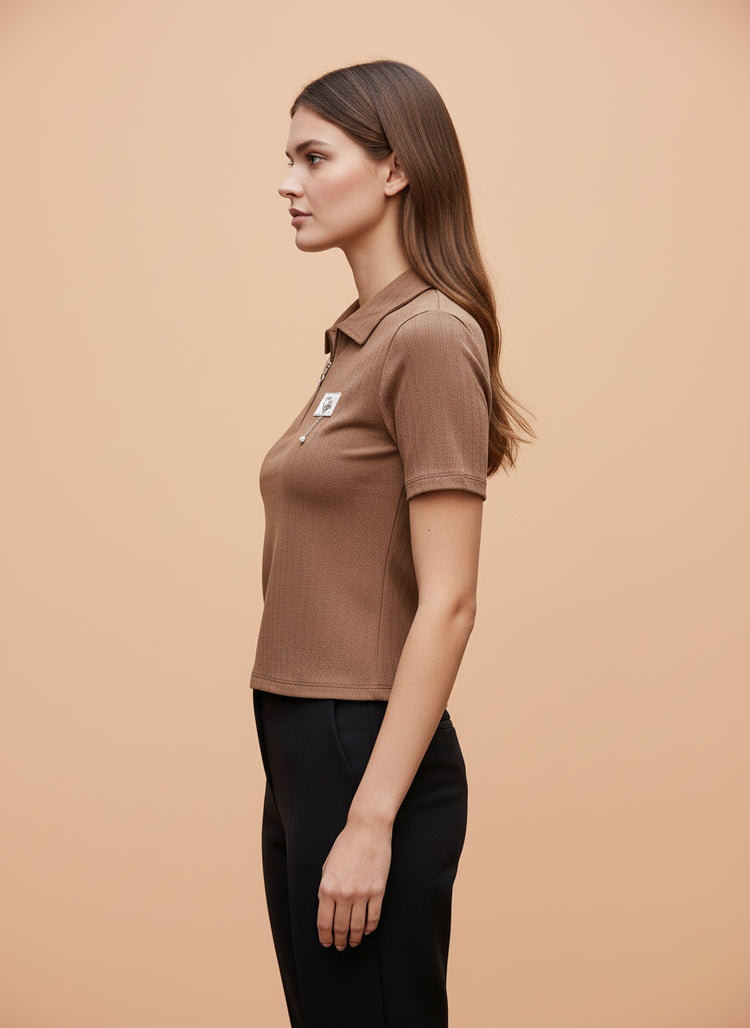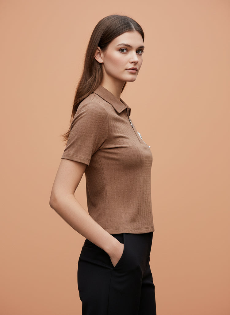 Warm, sophisticated aur effortlessly chic – yeh Brown Zip-Up Ribbed Polo Top aapke wardrobe ka rich aur versatile piece hai.