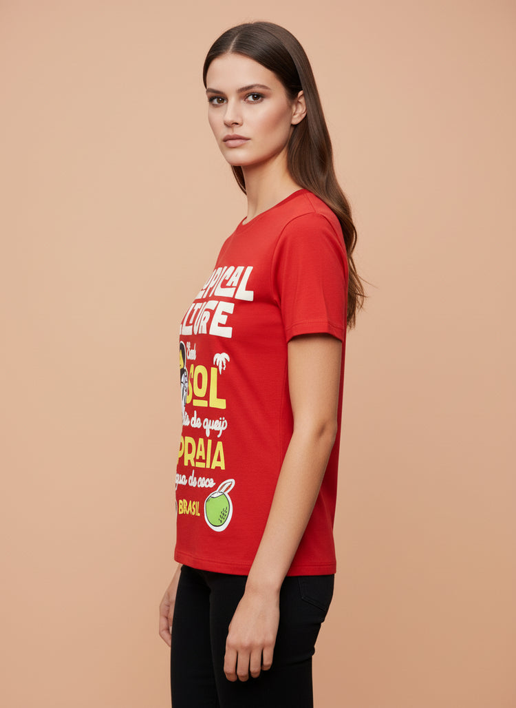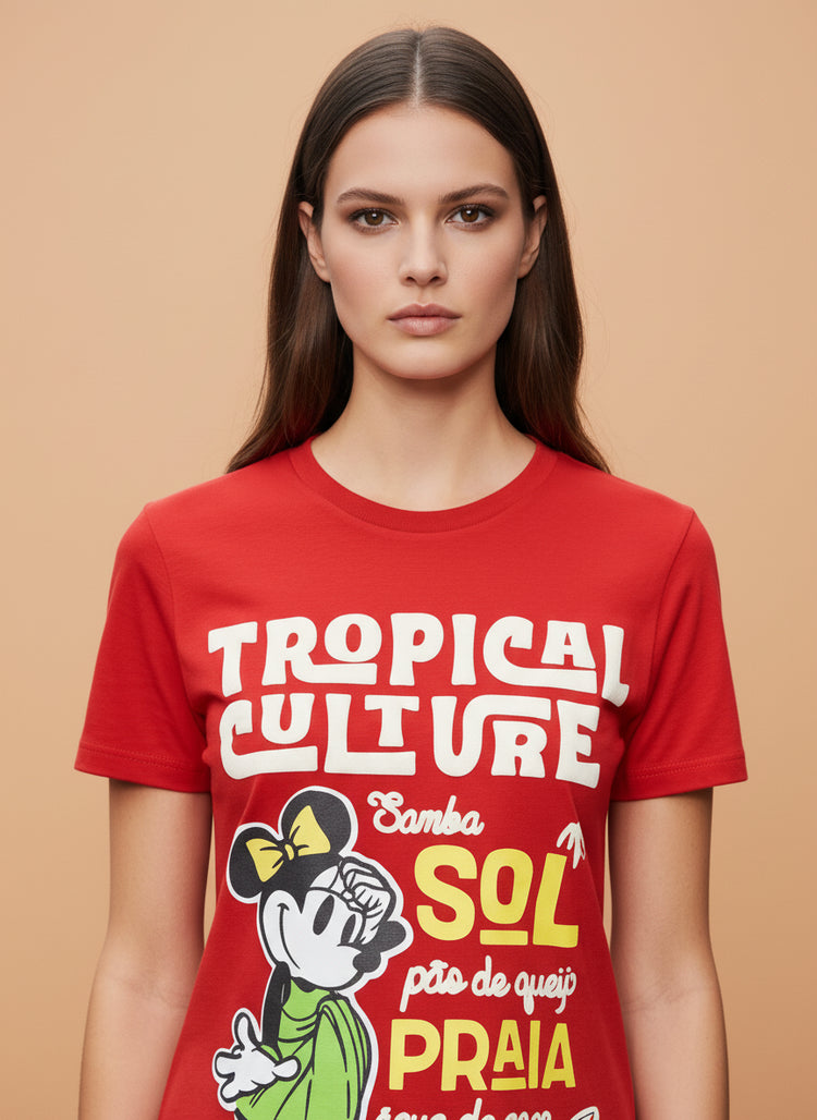 Make a vibrant and playful statement with this bold red tropical Minnie Mouse t-shirt. Featuring the fun “Tropical Culture” graphic print with Minnie Mouse in a green dress, along with Brazilian elements like Samba, Sol, Praia, and Água de Coco, this tee brings summer vibes and Disney charm together perfectly.