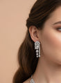 The sophisticated double-layer necklace features a sleek upper tennis strand and a lower layer with a stunning Y-shaped cascading drop pendant filled with sparkling CZ stones. The matching long chandelier earrings with multi-tier drops add graceful movement and extra dazzle from every angle.