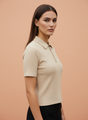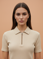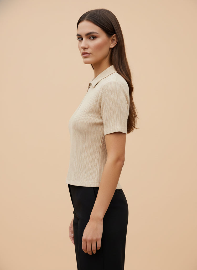 Women’s Beige Ribbed Knit Half-Zip Polo T-Shirt