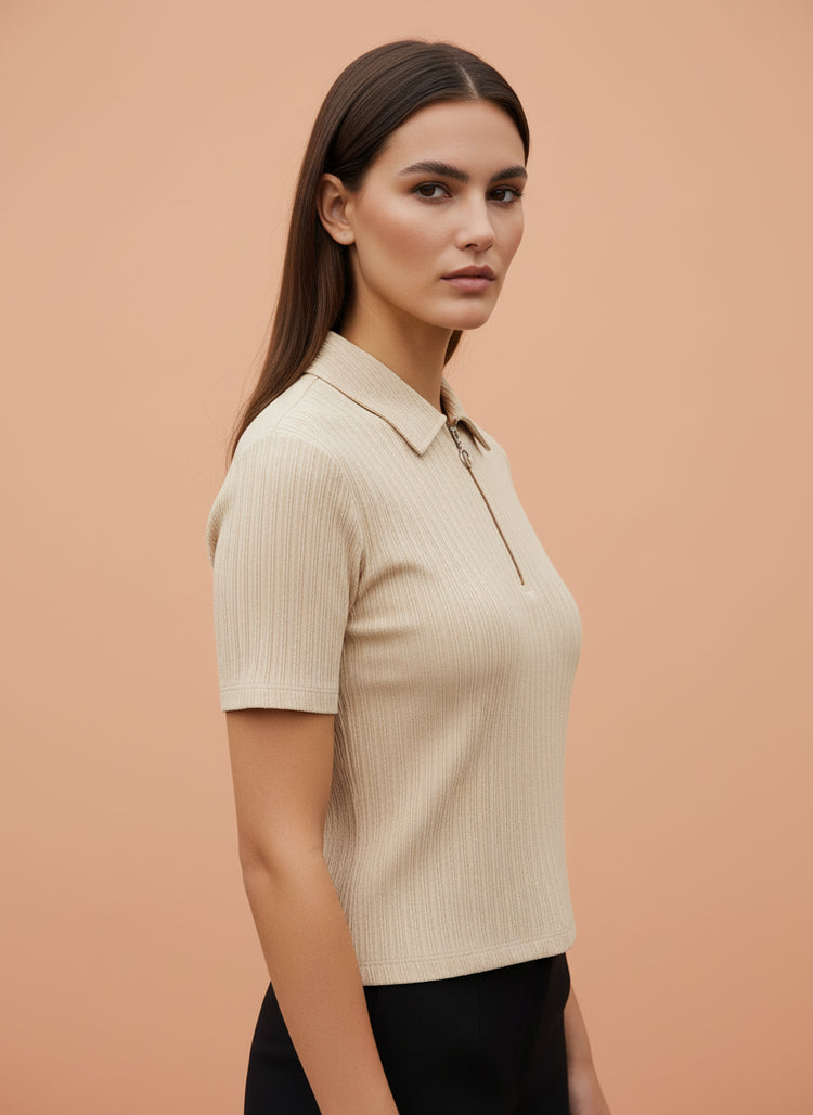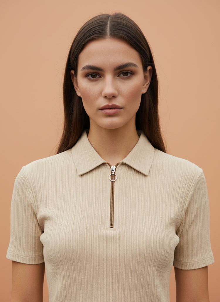 Minimal, modern aur ultra-elegant – yeh Beige Zip-Up Ribbed Polo Top aapke wardrobe ka most versatile aur sophisticated piece hai.