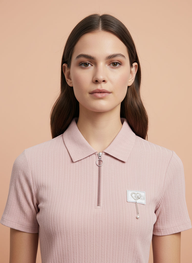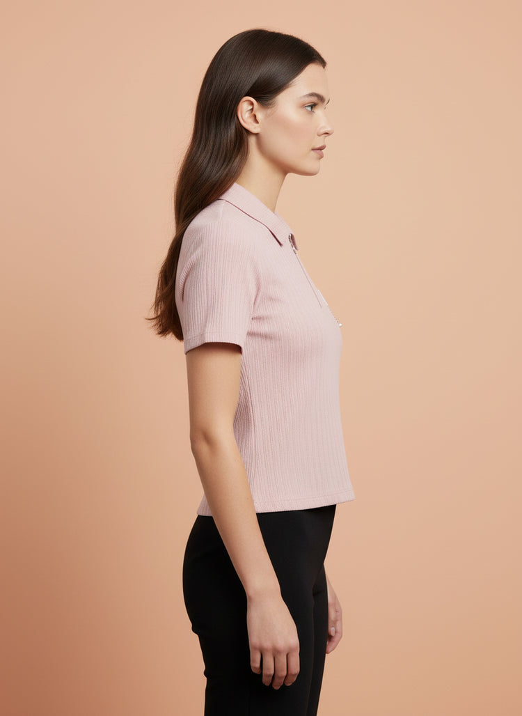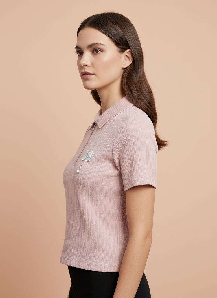 Soft, feminine aur gracefully stylish – yeh Light Pink Zip-Up Ribbed Polo Top aapke wardrobe mein ek delicate yet confident addition hai.