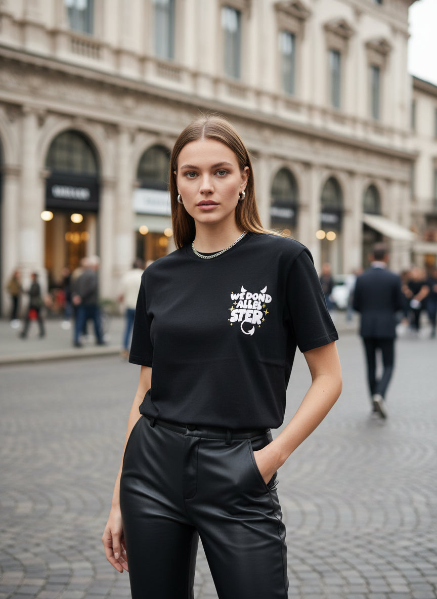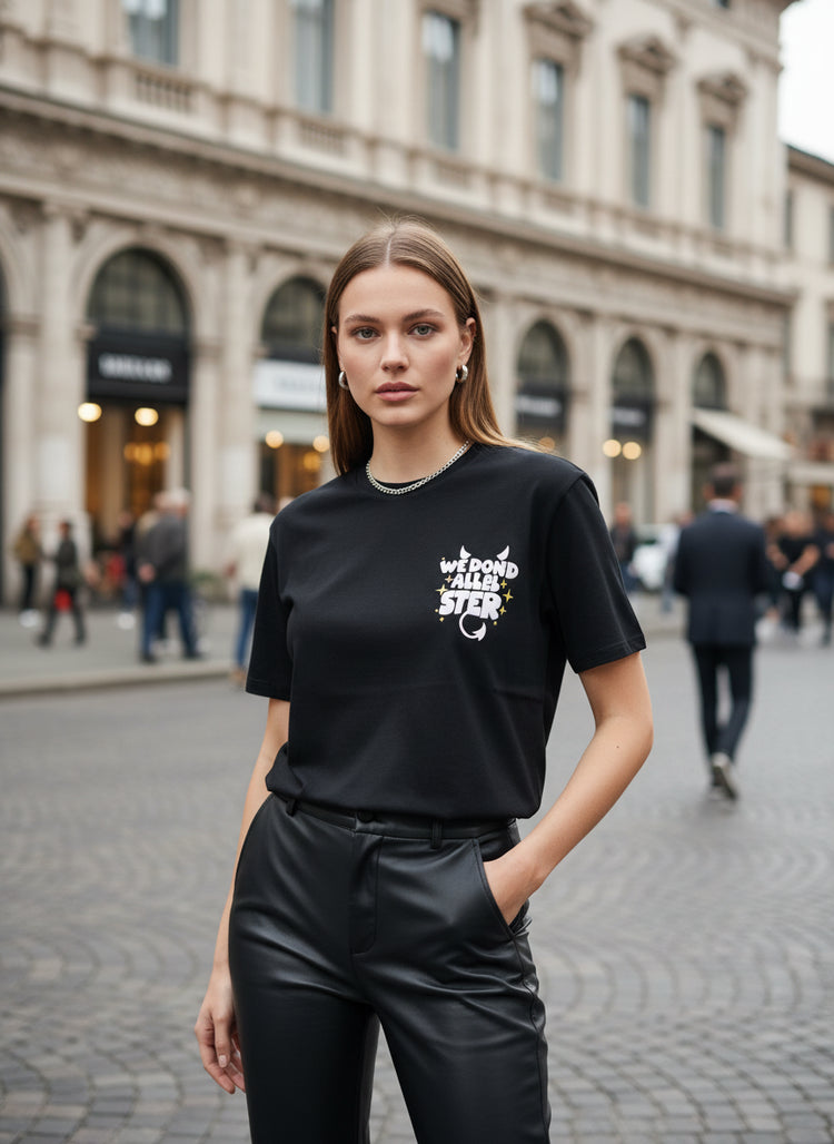 Make a cool & confident statement with this stylish Black Graphic T-Shirt featuring the fun "We Pond All Star" print with moon, stars, and sparkle design.