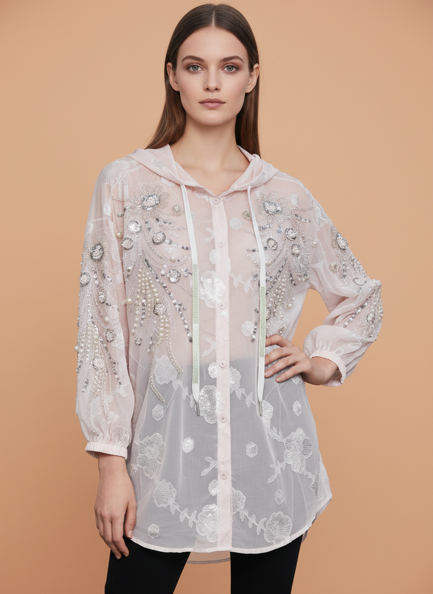 Add a touch of luxury to your wardrobe with this stylish women’s hooded top. Designed with luxury sheer fabric, this elegant piece features intricate embroidery and delicate detailing that gives it a high-end fashion appeal. The lightweight and breathable material ensures all-day comfort, while the trendy hooded design adds a modern twist to your casual look. Perfect for layering over camisoles or inner tops, it pairs effortlessly with jeans or fitted pants for a chic statement outfit.