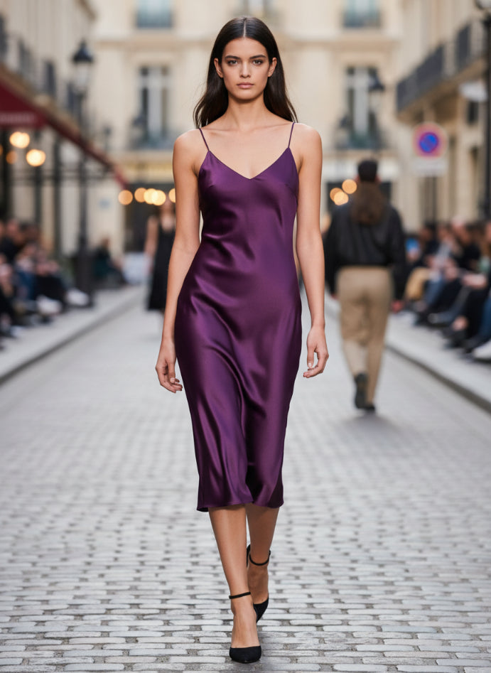 Elevate your wardrobe with this Luxury Satin Slip Dress in an elegant Deep Plum shade. Crafted from ultra-soft, premium satin, it offers a smooth, glossy finish that drapes beautifully on the body. The lightweight fabric feels gentle on the skin, making it perfect for all-day comfort.