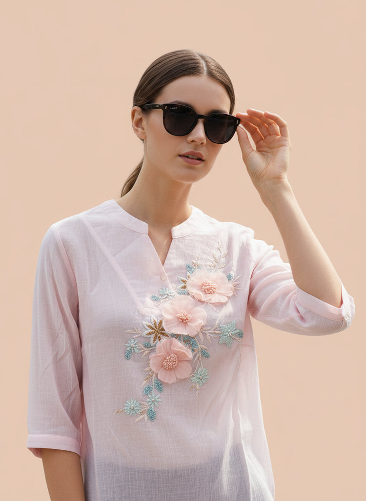 Upgrade your everyday style with this elegant Luxury women’s top, designed for a smart and comfortable look. Crafted from soft, breathable fabric, this Pink casual top features beautiful floral embroidery on the front that adds a premium and feminine touch. The lightweight material keeps you comfortable all day, while the 3/4 sleeves and relaxed fit make it perfect for daily wear, office, or casual outings. Pair it easily with jeans, trousers, or skirts for a chic modern look.