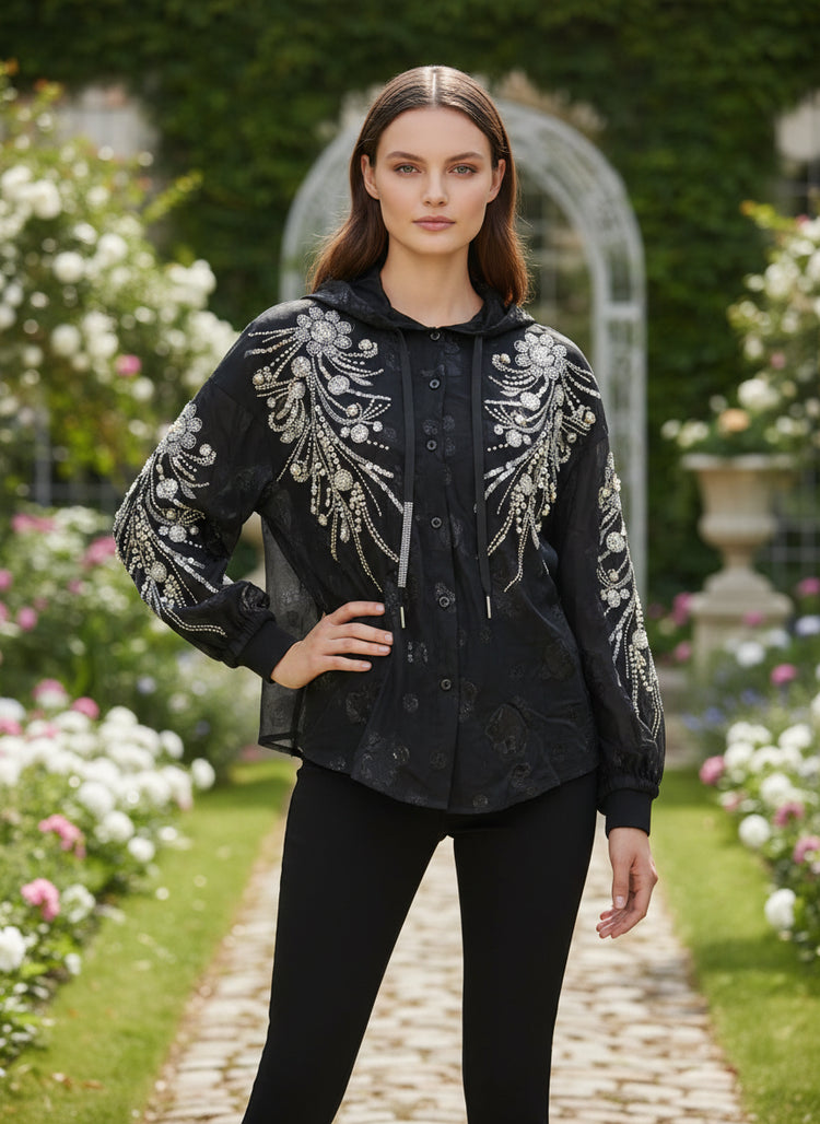 Add a touch of luxury to your wardrobe with this stylish Luxury women’s hooded top. Designed with premium sheer fabric, this elegant piece features intricate embroidery and delicate detailing that gives it a high-end fashion appeal. The lightweight and breathable material ensures all-day comfort, while the trendy hooded design adds a modern twist to your casual look. Perfect for layering over camisoles or inner tops, it pairs effortlessly with jeans or fitted pants for a chic statement outfit.